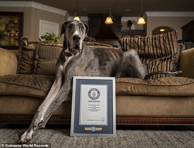Новый титул - "Самая высокая собака из ныне живущих", - получил пёс по кличке Зевс ростом 1,05 м в холке. Этот пёс живёт в Техасе, и съедает по 12 мисок собачьего корма в день. По словам хозяев, держать такую собаку недёшево.