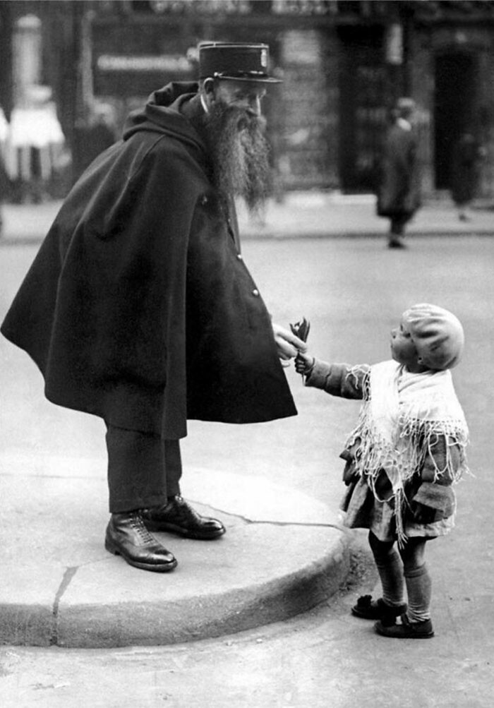 13. 1929. Маленькая девочка вручает лилии дежурному полицейскому у ворот Сен-Дени в Париже