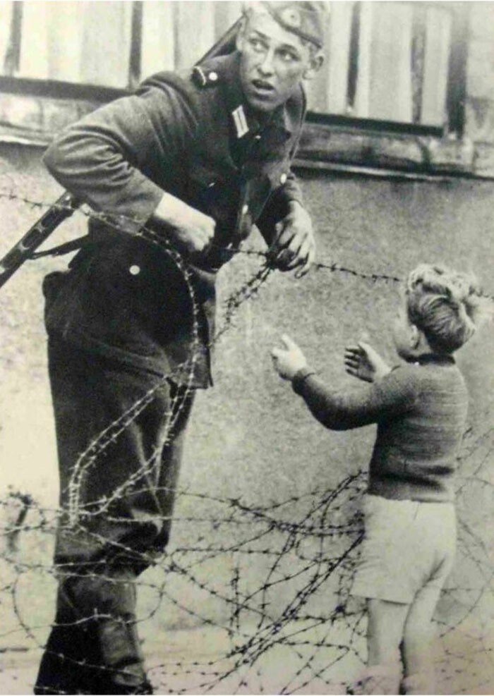 2. 1961 год. Солдат из Восточной Германии игнорирует приказ, помогая мальчику пересечь Берлинскую стену, чтобы тот воссоединился со своей семьей