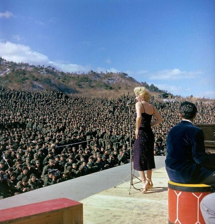 34. 1954. Мэрилин Монро выступает перед тысячами американских солдат в Корее