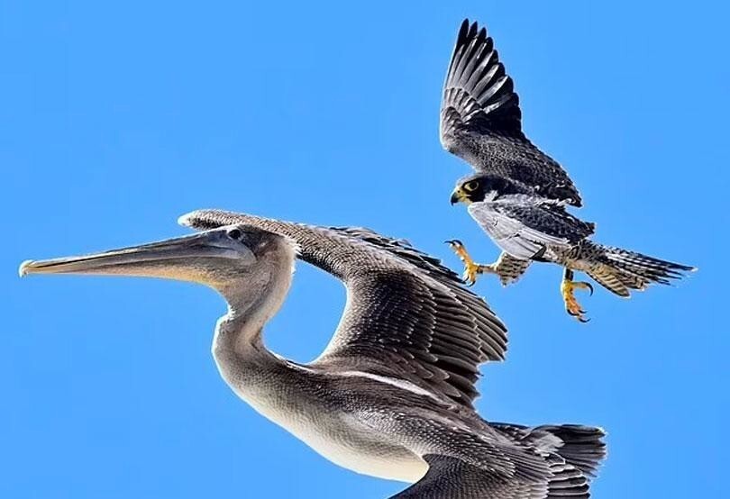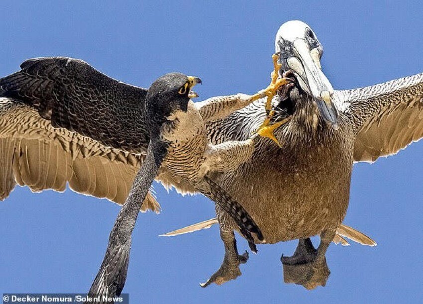 Эти эпичные кадры сделал фотограф Декер Номура (Decker Nomura) на пляже Торри-Пайнс в Сан-Диего, США. Он увидел, как пеликан подобрался слишком близко к месту гнездования сапсанов (соколов). Хотя пеликан и не хотел причинять вреда, ему всё равно досталось.