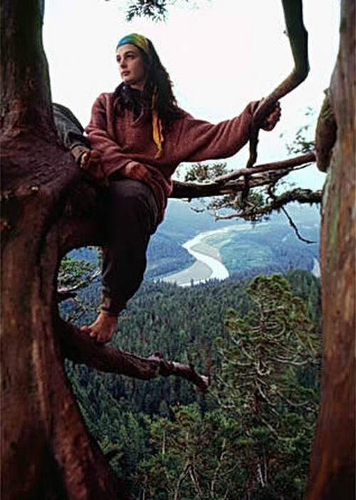 Она отправилась на запад на благотворительный регги-фестиваль, посвященный спасению старого леса, где связалась с группой «сидящих на деревьев», которые протестовали против сплошной вырубки секвойи компанией Pacific Lumber Company.
