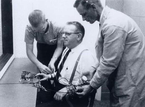 Некоторых участников убедили, что они будут бить других электрическим током. Они не знали, что удары током были фальшивыми, но, полагая, что они реальны, некоторые из участников были готовы применять эти удары током к другим людям.