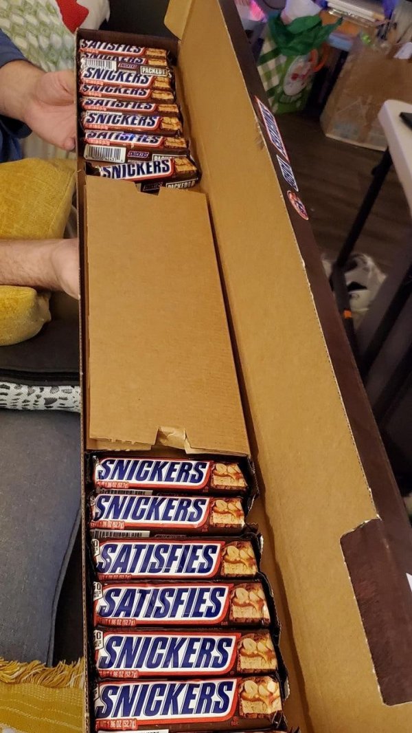 Эту коробку продают, как «метровый сникерс», хотя сбоку написано точное количество батончиков