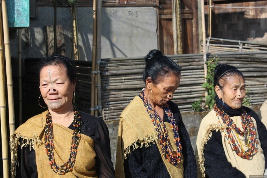 Согласно легенде, женщины апатани в предгорье Гималаев считались самыми красивыми, и их воровали соседние племена. Дабы прекратить практику, на лицо решили наносить татуировки. Одна толстая жирная линия прорисовывалась от кончика носа, шла по лбу и делила лицо пополам. Пять других пускали под нижней губой по подбородку.