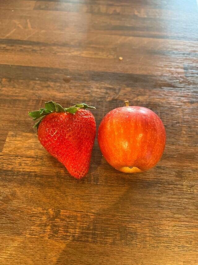 14. "Очень большая клубника рядом с очень маленьким яблоком"