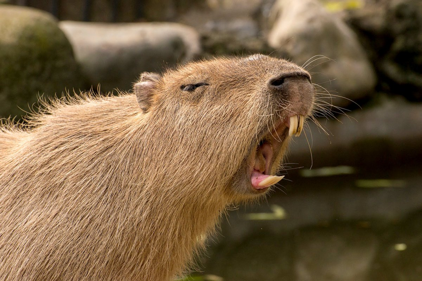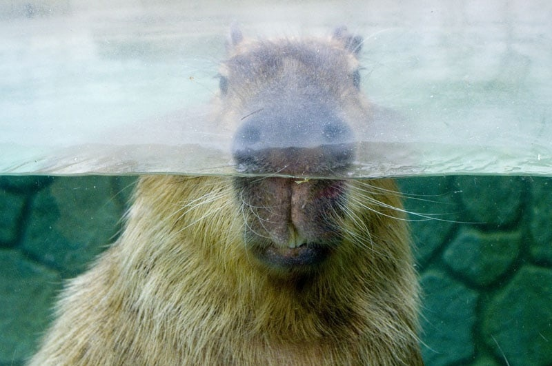 Несмотря на кажущуюся неповоротливость, звери отлично плавают и ныряют. Для этого у них развилось несколько адаптаций: густой жёсткий мех, состоящий из водонепроницаемого остевого волоса, перепонки между пальцев и морда кирпичом. То самое фирменное выражение у капибары не от того, что та постигла дзен. Всё куда прозаичнее: высоко посаженные глаза и ноздри позволяют грызунам дышать и видеть всё вокруг, пока их тело полностью скрыто водой.