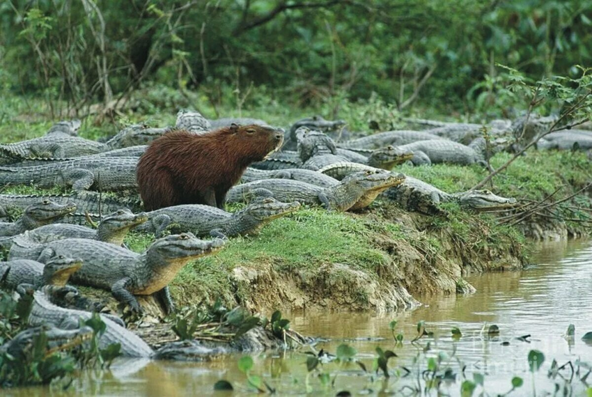 Этот сложный механизм и позволяет капибарам поддерживать массу: в среднем они весят чуть меньше 50 килограмм, но отдельные особи могут набирать все 90! По идее, такая гора мяса должна стать добычей для хищников №1. Так оно и есть: ягуары, оцелоты, крокодилы, кайманы и даже хищные птицы представляют серьёзную угрозу для грызунов. Но как капибарам удается сохранять спокойствие и положительный настрой? Почему даже их враги — крокодилы и кайманы — могут разделить с ними пляжное местечко под солнцем? У грызунов там что, прямые поставки новопассита?
