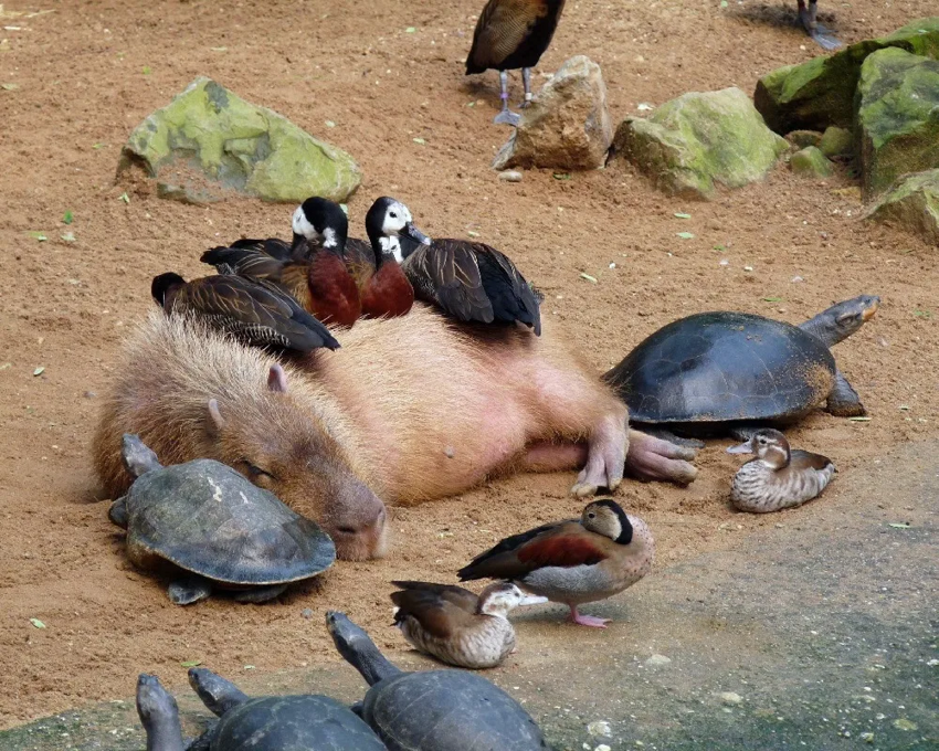А звери к пушистому пацифисту тянутся как на магнит. Ведь капибара для окружающих животных крайне полезна. В случае опасности грызуны предупреждают друг друга, а заодно и всех потенциальных жертв в округе. К тому же водосвинка — это не только обед для хищников, но и шведский стол для насекомоядных. Обезьяны и птицы облепляют капибару, как только та выходит погреться на суше. Они проводят грызуну спа процедуру, поедая паразитов с шерсти. А тот и рад.