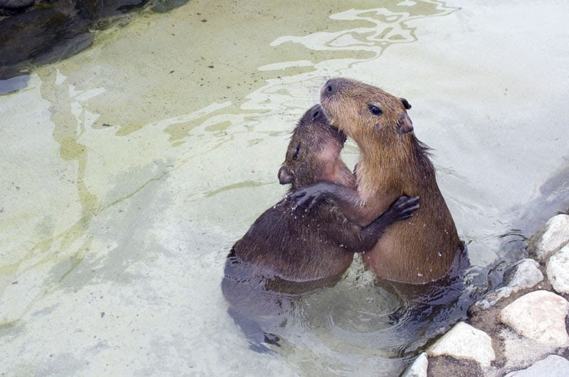 Вторая причина дружелюбия — общественный образ жизни. Живут капибары группами по 10-20 особей на площади в 10 гектар. А в засушливый сезон несколько сотен гигантских грызунов могут собираться на небольших участках возле водоёма. Но даже при таком раскладе драки в их стадах — редкость. Так что водосвинка давно привыкла к обществу и от других зверей не шарахается.