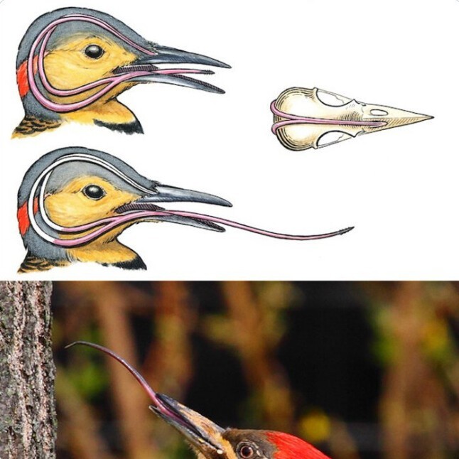 23. Язык дятла настолько длинный, что оборачивается вокруг его черепа. Это помогает защитить мозг от ударной силы, с которой дятел бьёт по стволу, и извлекать насекомых из глубоких щелей