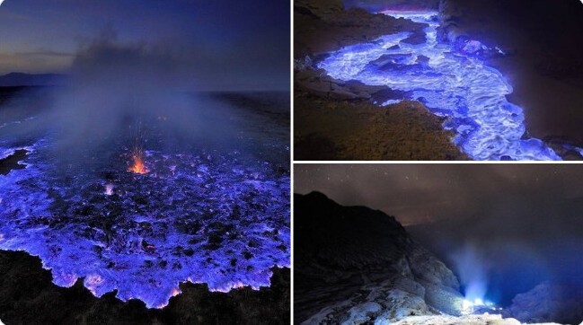 11. Ярко-синий вулкан Кавах Иджен в Индонезии. Извержение горящей серы