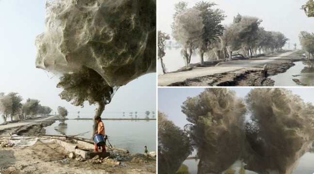 20. Миллионы пауков окутывают своей паутиной деревья в Пакистане, прячась от наводнений
