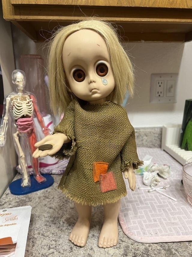 Маленькая мисс без имени — грустная кукла с безумными глазами, которую можно было приобрести лишь в 1965 году. Она носила холщовый мешок и вынуждала вас купить её, плача и напевая ужасно грустные стихи.