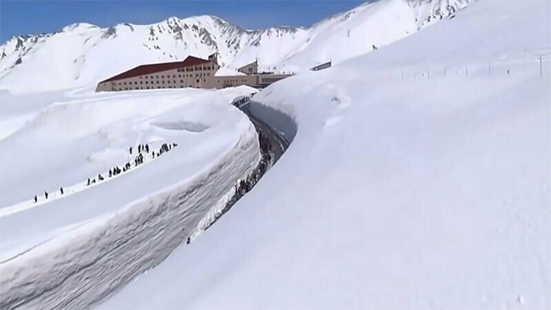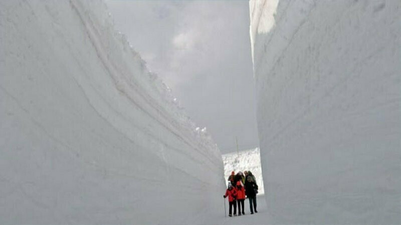 Снега здесь столько, что вокруг дороги появляются 20-метровые снежные стены.