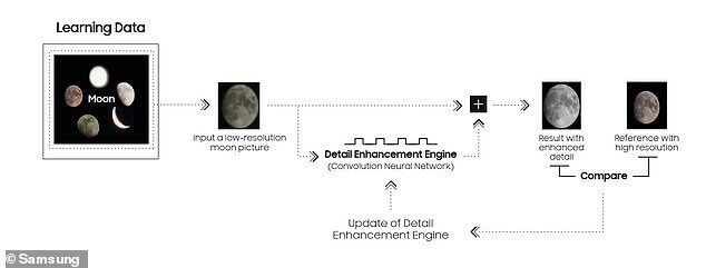 Компания утверждает, что алгоритм ИИ был обучен распознавать фотографии Луны, поэтому он может определять, когда она показывается объективу камеры. Затем он автоматически настраивает фокус и яркость изображения, чтобы сделать его максимально четким, прежде чем сделать несколько снимков. Наконец, механизм улучшения детализации ИИ «устраняет оставшийся шум и еще больше улучшит детали изображения». Однако компания не раскрывает подробностей, а значит, по мнению блогера, возможно, камера просто использует имеющиеся данные для создания реалистичной текстуры лунной поверхности, которой нет в оригинале.
