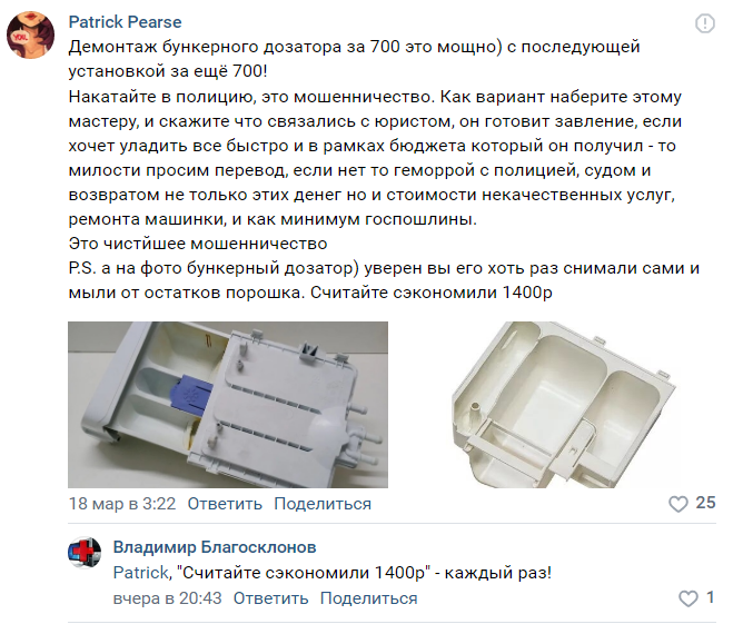 Под постом в ВК появилось много комментариев, в которых пользователи Сети разобрали прайс на услуги по деталям. В частности, многих изумил пункт о демонтаже и установке бункерного дозатора. 20 долларов, с которой справится любая домохозяйка - это, конечно, круто!