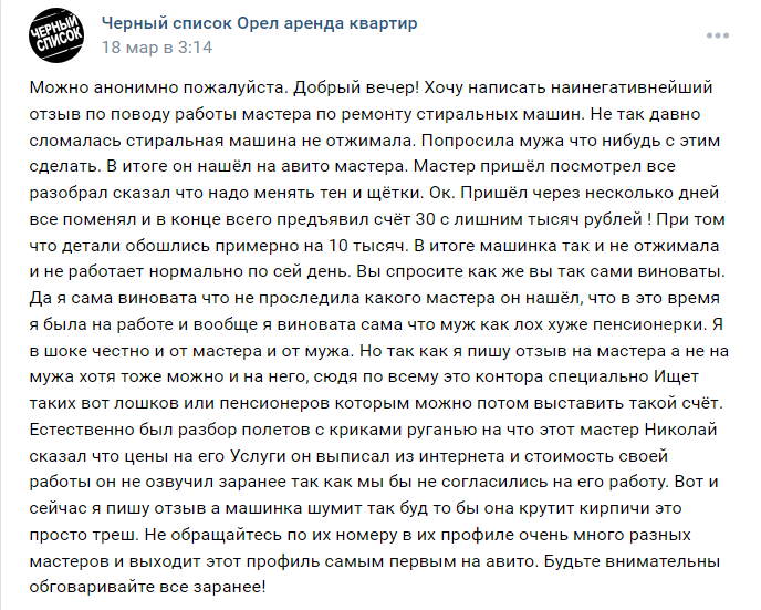"Естественно был разбор полетов с криками руганью, на что этот мастер Николай сказал, что цены на его услуги он выписал из интернета, и стоимость своей работы он не озвучил заранее, так как мы бы не согласились на его работу, — пишет женщина. — При этом, отремонтированная машинка хоть и работает, но, по её словам, шумит так, будто бы крутит кирпичи".