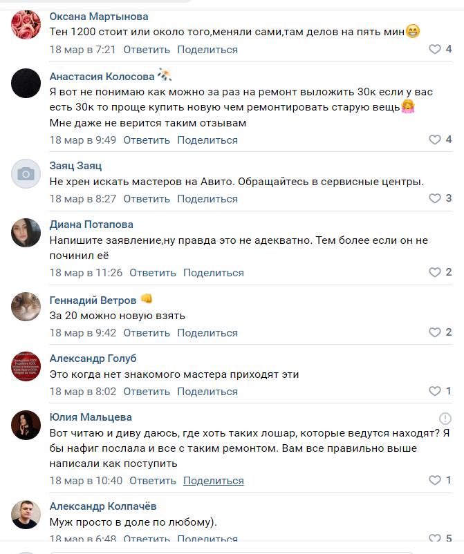 Многие советовали писать заявление в полицию о мошенничестве, другие недоумевали: как можно выложить за ремонт 450 долларов, если на эти деньги можно купить новую технику?