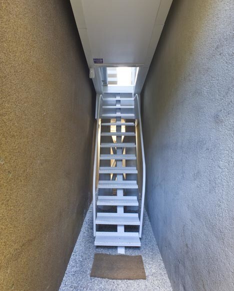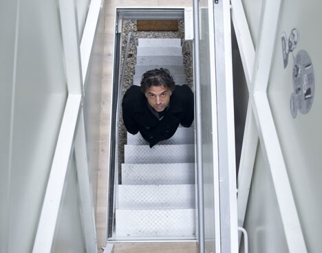 Корпус дома поднят на сваях, а лестница идет верникально от земли