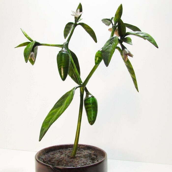 2. "Я вырезал это халапеньо из кудрявого клена и грецкого ореха. Если присмотреться, можно увидеть древесные узоры, просвечивающие на перцах"