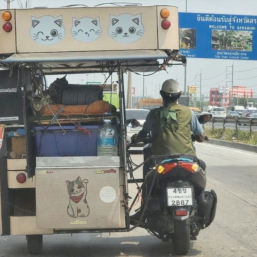 65-летний мужчина из Таиланда Човонг Тхепкохнедавно отправился в путешествие со своими 11-ю кошками — на мотоцикле с коляской.
