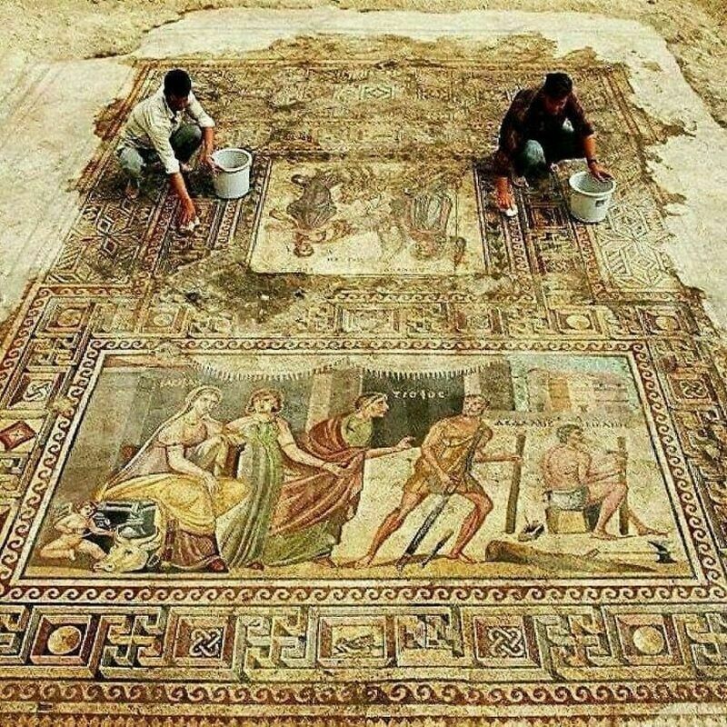 В Зевгме находится музей античной мозаики, тут собрана самая большая коллекция в мире площадью 1700 м2. Мозаичная картина с фото запечатлела Дедала и Икара.