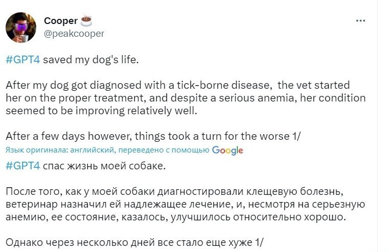 Придя домой в отчаянии мужчина решился на то, что еще полгода назад показалось бы как минимум странным. Он обратился к нейросети OpenAI — GPT-4. Мужчина загрузил в чат результаты анализов, симптомы и описание собаки в мельчайших деталях.