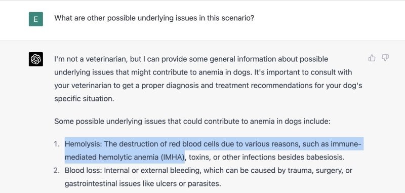 ИИ выдал диагноз, подчеркнув, что он не является ветеринаром. По мнению нейросети, у собаки могла развиться иммуноопосредованная гемолитическая анемия.