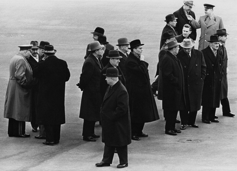 На первом плане – Никита Хрущев; в профиль в очках – Михаил Суслов; рядом с ним в светлой шляпе – Николай Шверник; рядом с ним – Леонид Брежнев; следующий –Николай Подгорный; с усами – Анастас Микоян; рядом с Микояном – Дмитрий Полянский; за Хрущевым – Андрей Громыко; в шинели слева – Родион Малиновский, рядом с ним усами – Борис Пономарев.