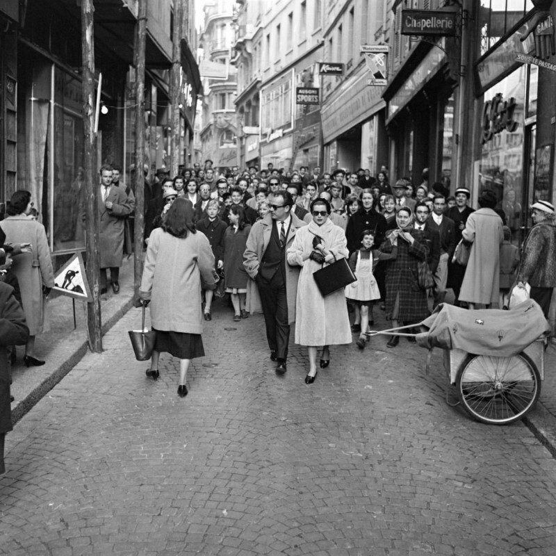 Грейс Келли, принцесса Монако, и ее муж Ренье III, князь Монако, привлекли внимание любопытных горожан во время шоппинга в Лозанне, Швейцария, 1956 год