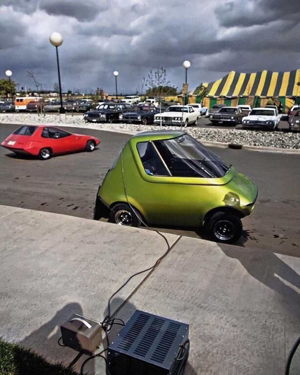 Городской электромобиль General Motors на подзарядке. На заднем плане — электромобиль EBS «Сандэнсер». Фото 1973 года