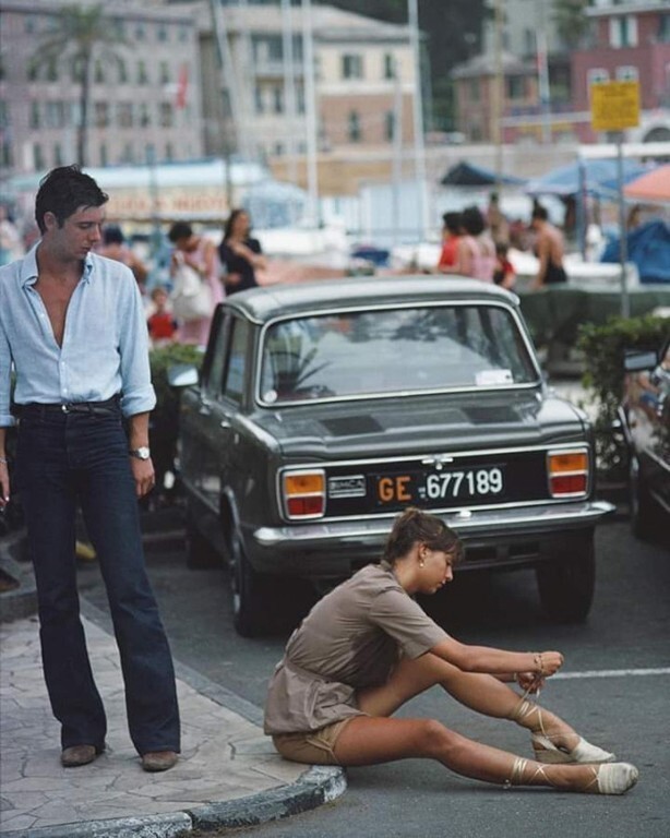 Девушка завязывает сандалии на тротуаре в порту Портофино, август 1977 года