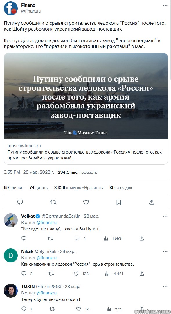 - Путину сообщили о срыве строительства ледокола «Россия» после того, как армия разбомбила украинский завод-поставщик