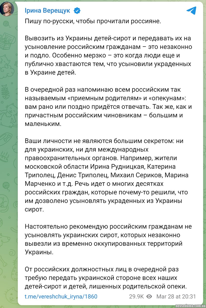 - Вице-премьер Украины Ирина Верещук обратилась по-русски к тем россиянам, кто считает нормальным усыновлять вывезенных из Украины украинских детей