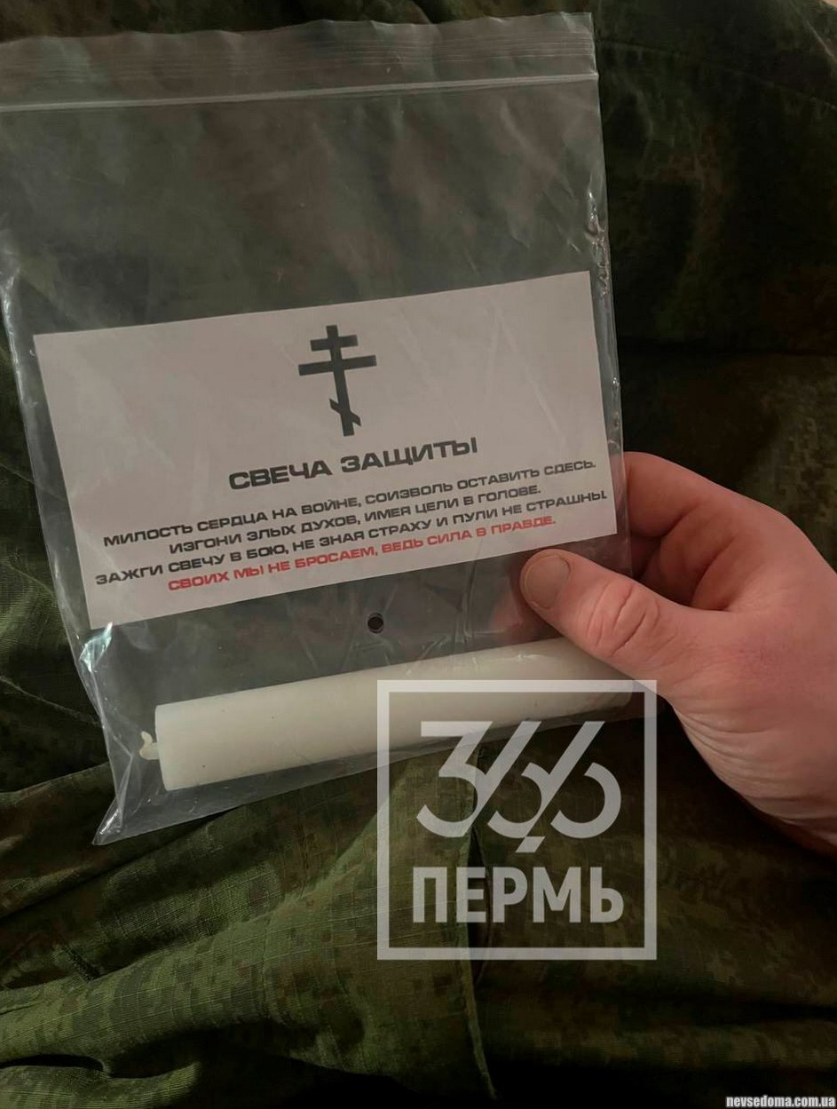 - Пермским мобилизованным выдали «свечи защиты», которые предлагается зажечь прямо в бою «Зажги свечу в бою, не зная страху и пули не страшны. Своих мы не бросаем, ведь сила в правде», — написано на упаковке со «свечой защиты».