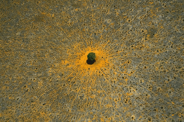 Это «Дерево жизни», акация, которая растёт в Национальном парке Цаво, Кения. Линии, ведущие к дереву и от него — это тропы, оставленные животными, которые ищут его тень или листья. Зелёные точки, усеивающие местность, являются молодыми побегами акации.