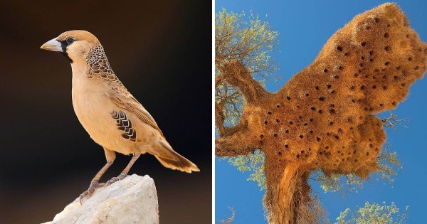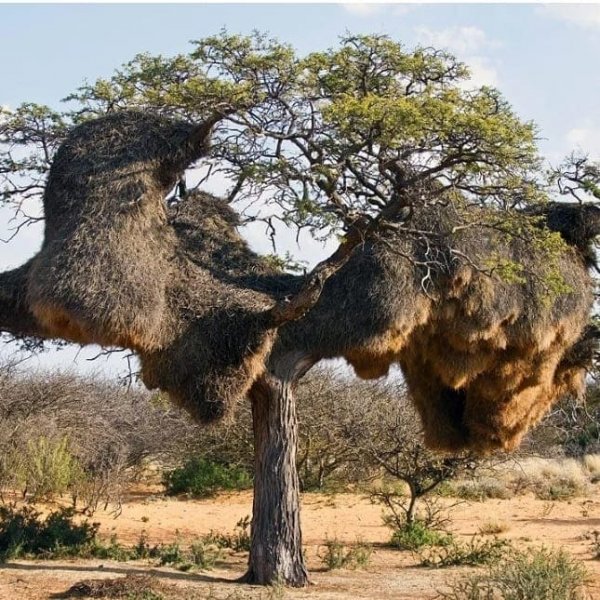 Гигантское гнездо общественного ткача (Philetairus Socius) в Намибии. Эти гнёзда считаются самыми большими и самыми густонаселёнными домами на деревьях в мире. Некоторые из них могут весить до тонны. Можно с уверенностью сказать, что ткачи делают свою работу на совесть, потому что построить такое великолепное и прочное общежитие сможет далеко не каждый зверь.