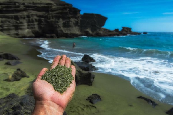 Зелёный песок на гавайском пляже, который содержит большое количество полудрагоценного минерала хризолита