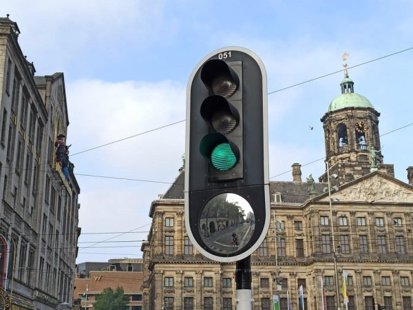 Светофор с зеркалом, позволяющий водителям видеть пешеходов/велосипедистов, находящихся в их слепых зонах