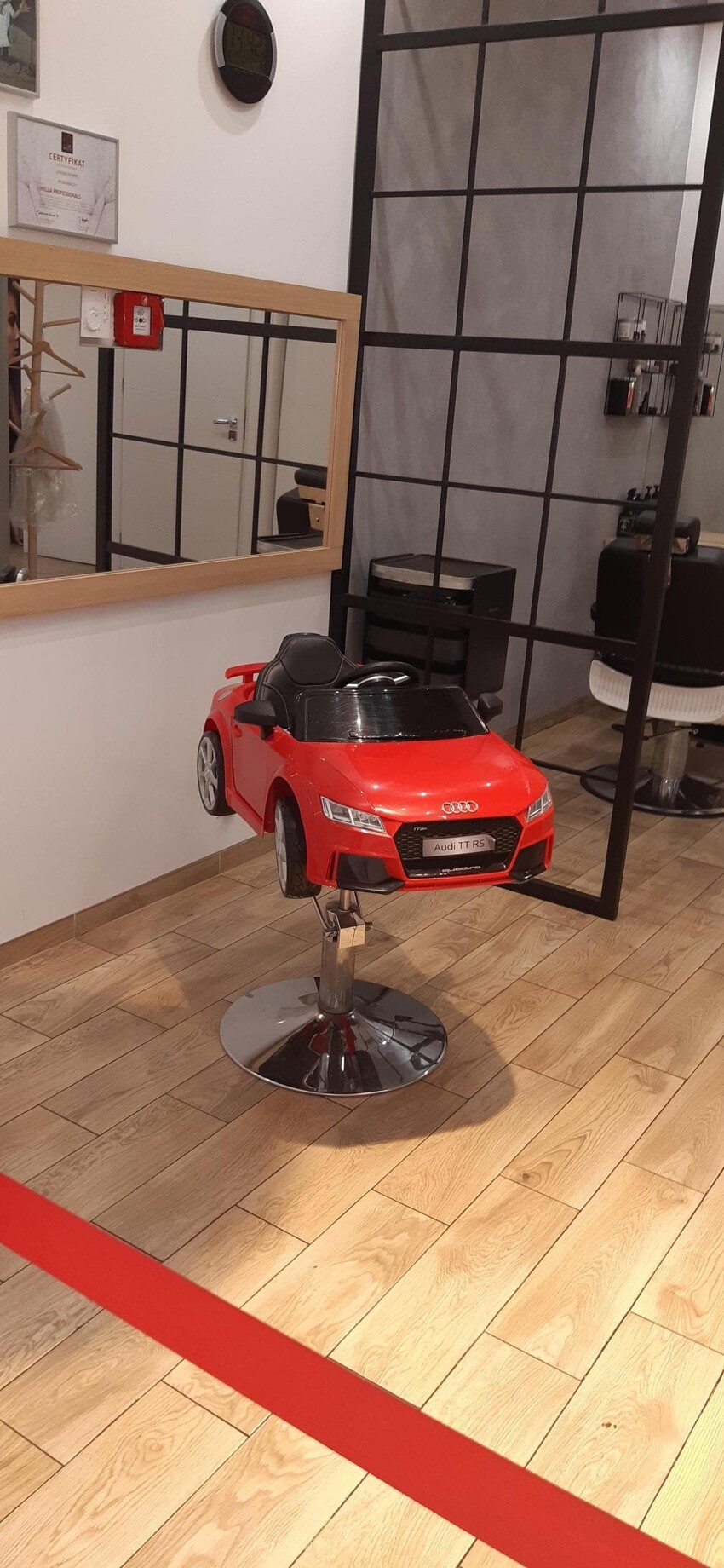 Кресло у парикмахера для маленьких деток выполнено в виде машины, чтобы они не боялись стричься