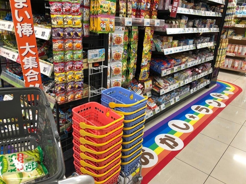 Маленькие продуктовые корзинки специально для детей у прилавка со сладостями
