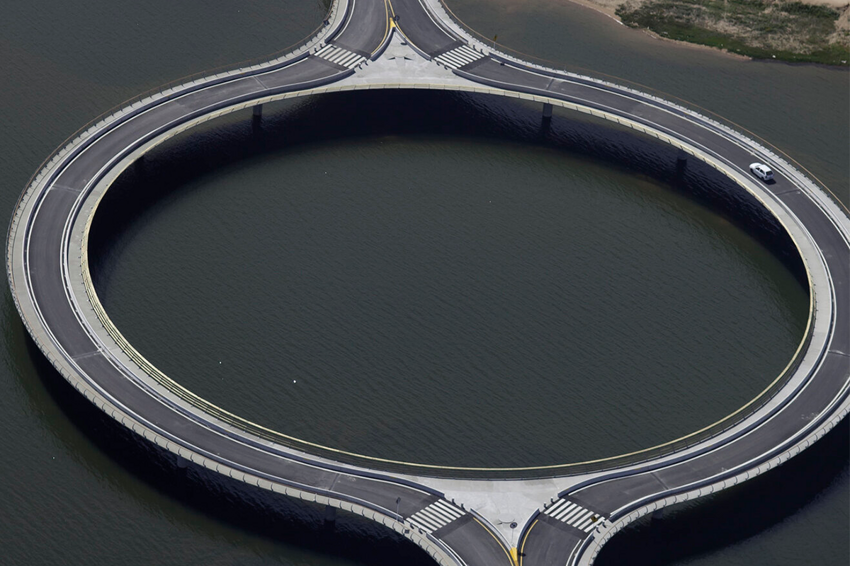 Архитектор спроектировал круглое сооружение: дорожное полотно, подойдя по эстакаде вдоль берега к лагуне, раздваивается и образует круг. На его половинах движение становится односторонним по полосе в каждом направлении. Из-за формы моста движение на нем ограничено 30 км в час.
