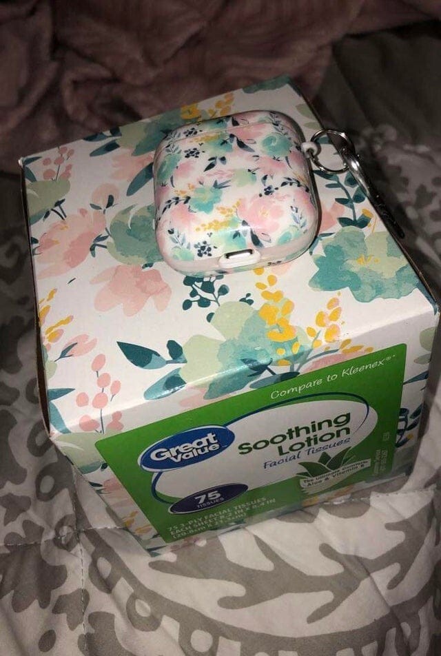 Мои аирподсы оказались с таким же принтом, что и упаковка салфеток