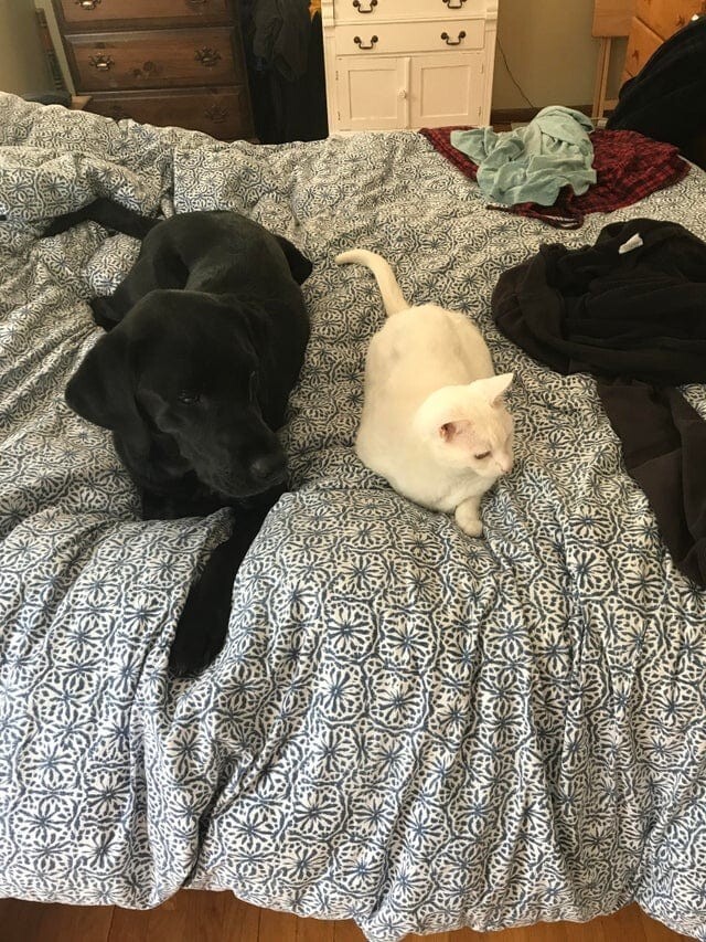 Мои кот и собака приняли одинаковые позы на этом снимке
