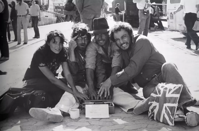 Карен Аллен, Стивен Спилберг, Харрисон Форд и Джон Рис-Дэвис издеваются над Ларри Кэзданом, делая вид, что вносят правки в его сценарий