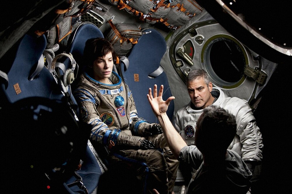 5. Режиссер Альфонсо Куарон готовит Сандру Баллок и Джорджа Клуни к сцене в фильме "Гравитация" 2013 год