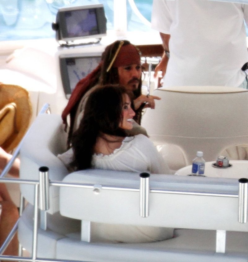 1. Пенелопа Круc и Джонни Депп в ожидании съёмок сцены на острове в "Пиратах Карибского моря: На странных берегах", 2011 год