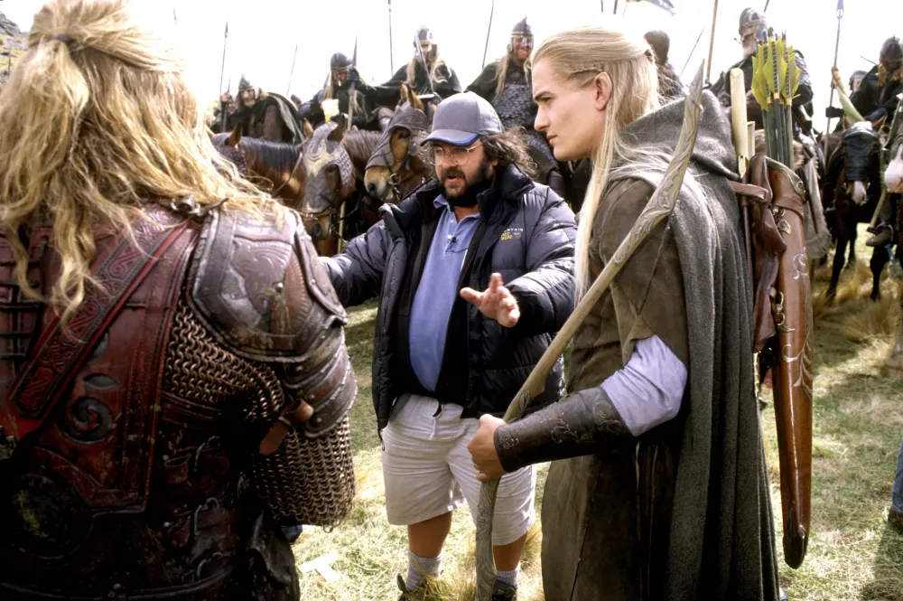 11. Режиссер Питер Джексон предупреждает Леголаса (Орландо Блум) об опасности отсутствия солнцезащитных средств на съемках "Властелина колец: Две башни" 2002 год
