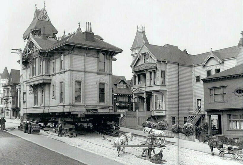 Снимок, сделанный в самом начале 20 века в одном из калифорнийских городов, когда семьи, желавшие переехать, могли перевезти с собой и свой дом.